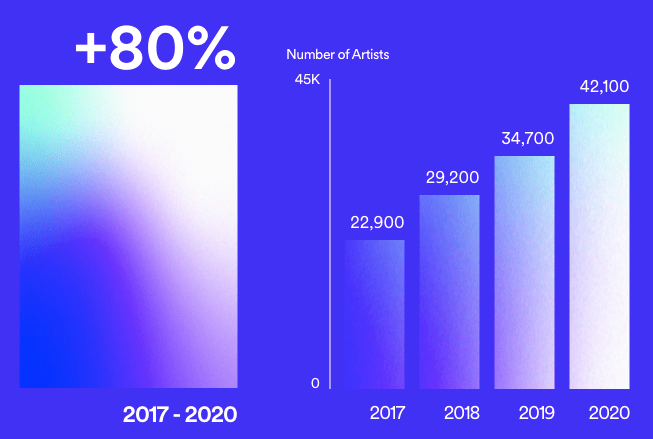 Więcej twórców tworzy – i odnosi sukcesy – niż kiedykolwiek wcześniej. W 2020 roku ponad 76 000 artystów zostało po raz pierwszy dodanych do playlist Spotify, z czego znaczna większość została odkryta dzięki narzędziu Spotify do tworzenia playlist, które jest swobodnie dostępne dla wszystkich artystów. Ponadto, od 2020 roku, 57 000 artystów stanowi 90% miesięcznych strumieni na Spotify – liczba ta wzrosła czterokrotnie w ciągu zaledwie sześciu lat. Oznacza to, że coraz większa i coraz bardziej zróżnicowana grupa artystów znajduje swoich fanów.