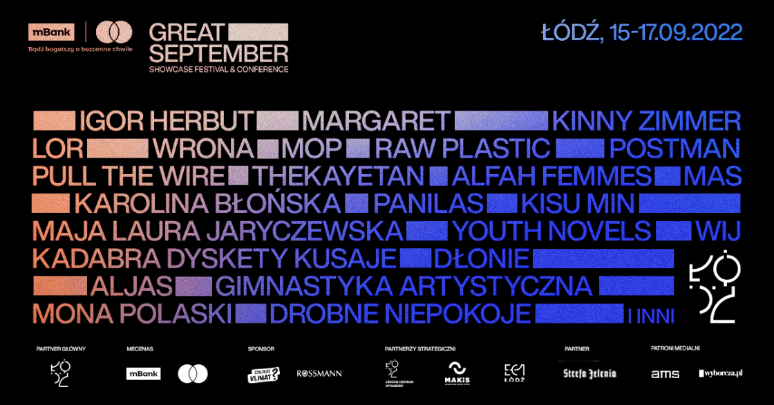 Great September Showcase Festival & Conference organizowany jest przy wsparciu miasta Łódź i Łódzkiego Centrum Wydarzeń i odbędzie się w dniach 15-17 września w kilkunastu klubach w Łodzi. To największy tego typu festiwal w Polsce, w którym oprócz koncertów gwiazd i starannie dobranych debiutantów (w sumie wystąpi ponad 100 wykonawców!) odbędzie się część konferencyjna z udziałem artystów i przedstawicieli branży muzycznej. Karnet na festiwal, uprawniający do wstępu na wszystkie wydarzenia aktualnie dostępny jest w cenie 129 zł.