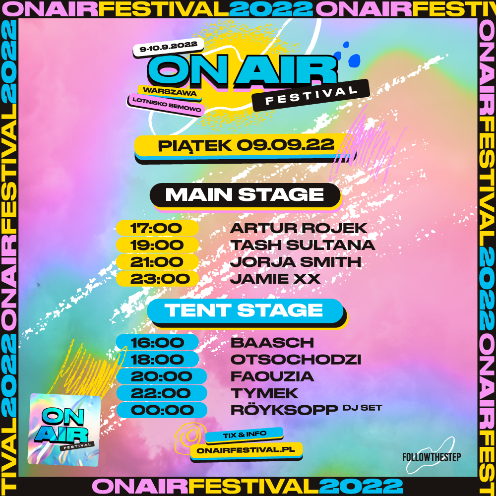 Podczas 1. edycji debiutującego festiwalu o charakterze miejskim – ON AIR Festivalu – wystąpią m.in.: Tame Impala, The Kooks, Jamie xx, Jorja Smith, The Comet is Coming, Celeste, Faouzia, Röyksopp, Tash Sultana, Polo & Pan, Alexandra Savior, Artur Rojek, Ralph Kaminski, Kaśka Sochacka i inni.
