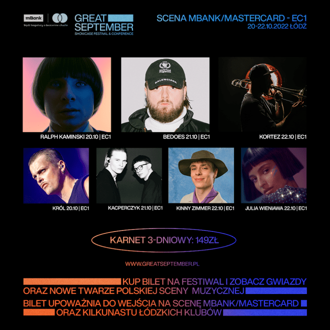 Koncerty na zlokalizowanej przy Centrum Nauki i Techniki EC1 scenie mBank/ Mastercard zgodnie z pierwotnym założeniem miały odbywać się w ciągu dwóch z trzech festiwalowych dni, ale w nowej dacie (20-22 października) największa ze scen łódzkiego Great September będzie funkcjonować o dzień dłużej, a na jej deskach wystąpi jeszcze większa liczba artystów i artystek. Do lineupu sceny mBank/ Mastercard dołączają Kortez, Bedoes i Król.