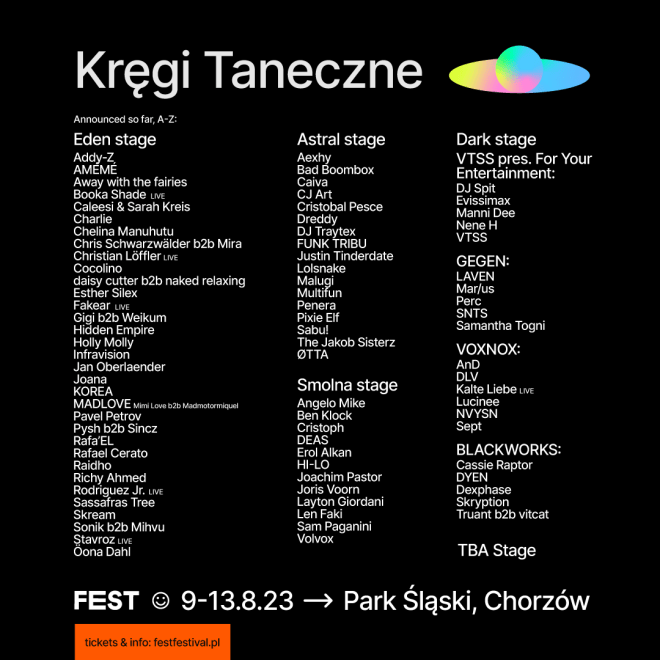 Kręgi Taneczne to integralna część festiwalu od jego zarania – enklawa muzyki elektronicznej, która gra przez wszystkie dni FEST Festivalu. Usytuowane w najpiękniejszych zakamarkach Parku Śląskiego w Chorzowie sceny będą gościć najznamienitszych reprezentantów poszczególnych nurtów elektroniki i zaspokoją potrzeby wszystkich osób żądnych najlepszych tanecznych rytmów. Wcześniej line-up tej strefy otworzyli m.in.: Sam Paganini, HI-LO, Len Faki, Layton Giordani, Erol Alkan, Christian Löffler, Richy Ahmed, Cristobal Pesce, Skream czy Perc. Poniżej prezentujemy kolejnych artystów, których będzie można posłuchać na 4 z 5 scen Kręgów Tanecznych. Niedługo ogłosimy także skład nowej sceny!