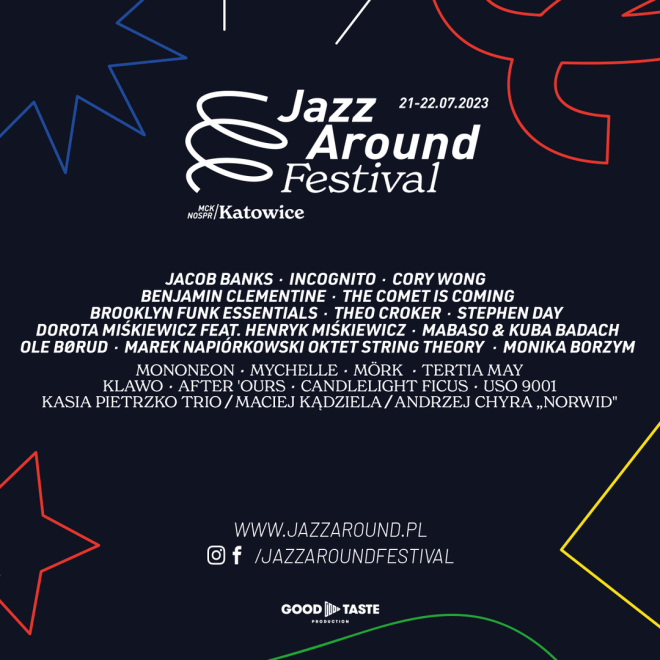 Najlepsza muzyka z pogranicza jazzu, funku i groove’u wypełni dwa ciepłe, lipcowe wieczory w stolicy Śląska. Jacob Banks, Benjamin Clementine, Theo Croker, Mychelle, MonoNeon, MaBaSo i Kuba Badach, Klawo, Monika Borzym, USO 9001 – to artyści i artystki, którzy dopełniają line-up Jazz Around Festival 2023. Druga odsłona wydarzenia już 21 i 22 lipca w na scenach katowickiego MCK i NOSPR. Bilety dostępne w sprzedaży na jazzaround.pl.