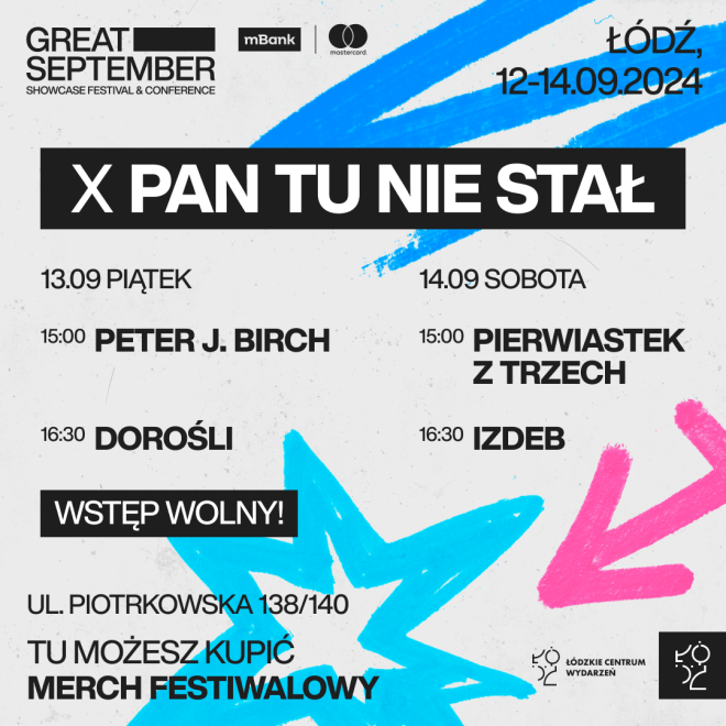 Scena Pan Tu Nie Stał będzie jedną z wielu, które zagrają w tym roku na Great September. Koncerty odbędą się w różnych miejscach miasta, które12-14 września zamieni się w wyjątkowy festiwal. Najważniejszym jego punktem jest Scena Główna mBank/Mastercard, w tym roku usytuowana w Pasażu Schillera. W tym roku posiadacze karnetów mogą wejść do specjalnej strefy ustawionej najbliżej sceny, pozwalającej na jeszcze lepszy odbiór wszystkich zaplanowanych na niej występów.