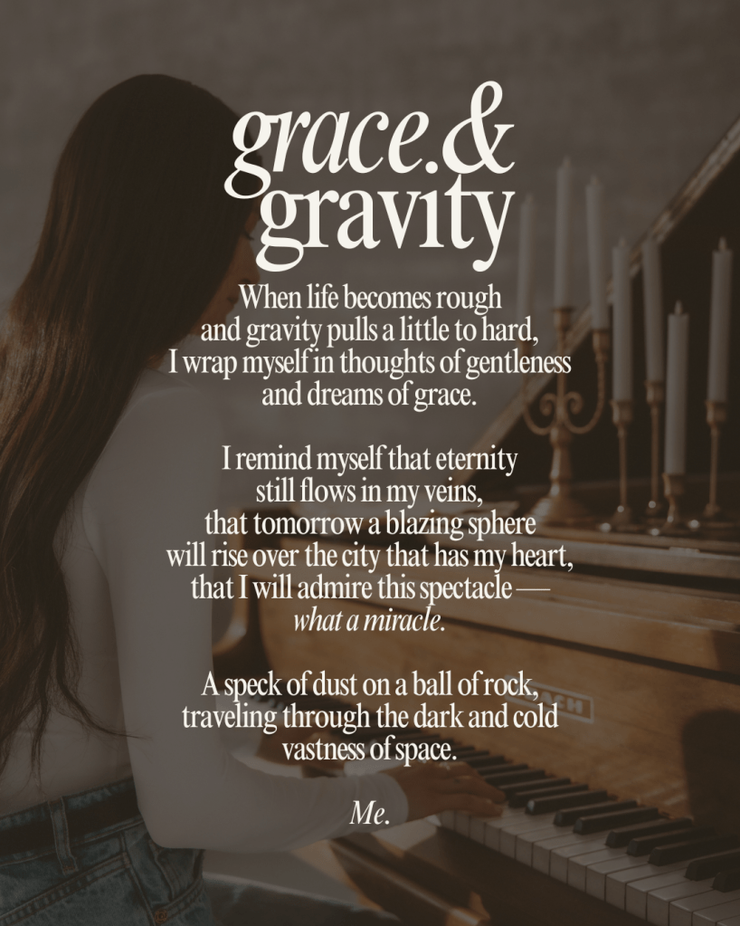 „Grace & Gravity” to muzyczna medytacja nad równowagą między ciężarem a łagodnością — refleksyjna, ale pełna czułej nadziei. Utwór powstał podczas 150-dniowego wyzwania twórczego i został zarejestrowany w domowym studiu artystki, na filcowanym pianinie, co nadaje mu wyjątkowej bliskości i organiczności. Jak podkreśla Almira, kompozycja jest efektem improwizacji inspirowanej zapiskami z dziennika i wschodem słońca nad Warszawą.